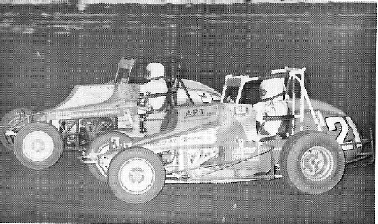 Johnny Anderson (21) races to the inside of Gary Patterson in Calistoga Speedway action. Anderson was a winner on 9/23/78 at the famed West Coast Half-Mile.