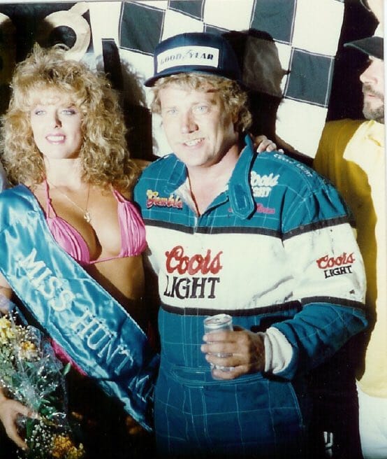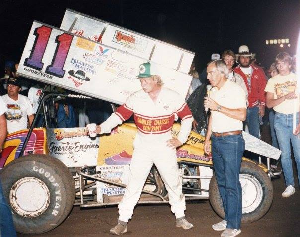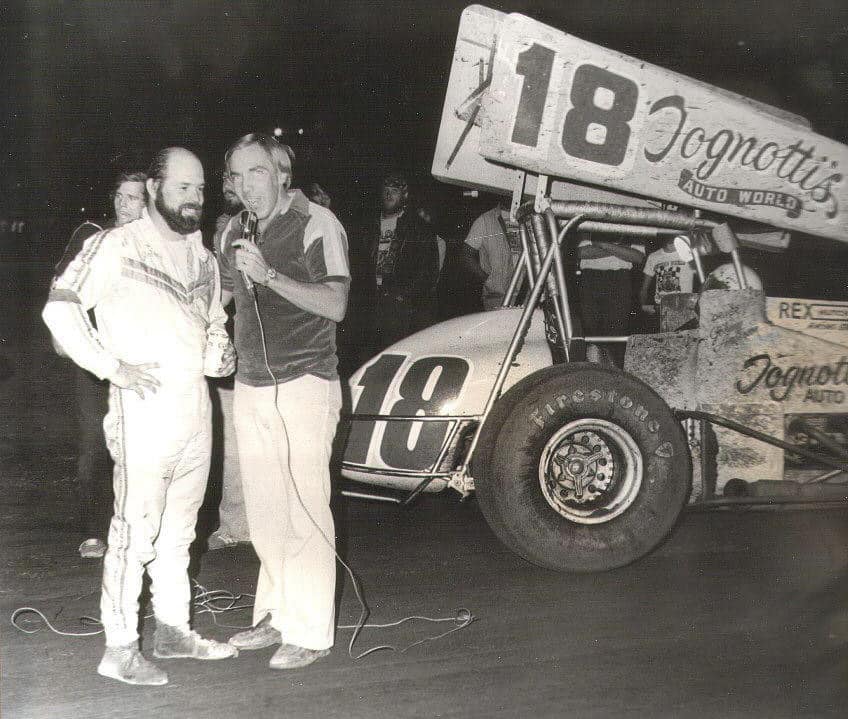 Johnny Anderson is interviewed by Gary Gerould after scoring the win in the first Gold Cup held at Chico’s Silver Dollar Speedway on 9/27/80.