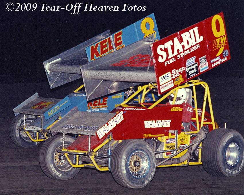 Doug Wolfgang (4x) leads Shane Carson (20) en route to his first “Outlaw” win in California at San Jose’s Half-Mile on 10/5/79.