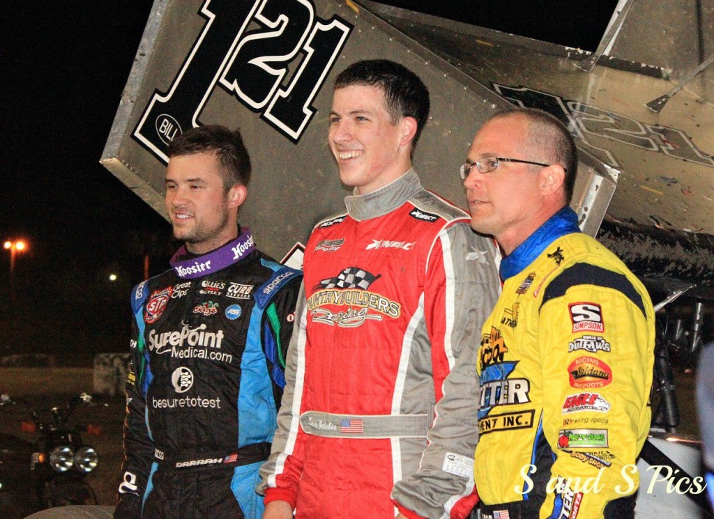 Kyle Larson Celebrates his Gold Cup Prelim. Win on 9/7/23. Shane Golobic (right) was 2nd, Corey Day (left) was 3rd.
